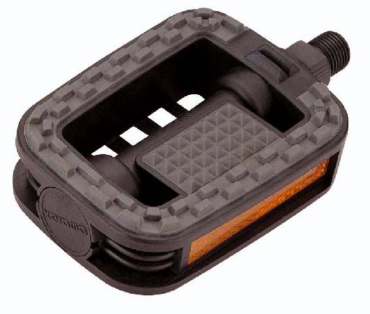 Пластик. педали с противоскользящей накладкой на рамке и насыпными подшипниками. Светооражатели для безопасности на дороге. Подходят для велосипедов треккинг. Вес 393 g.