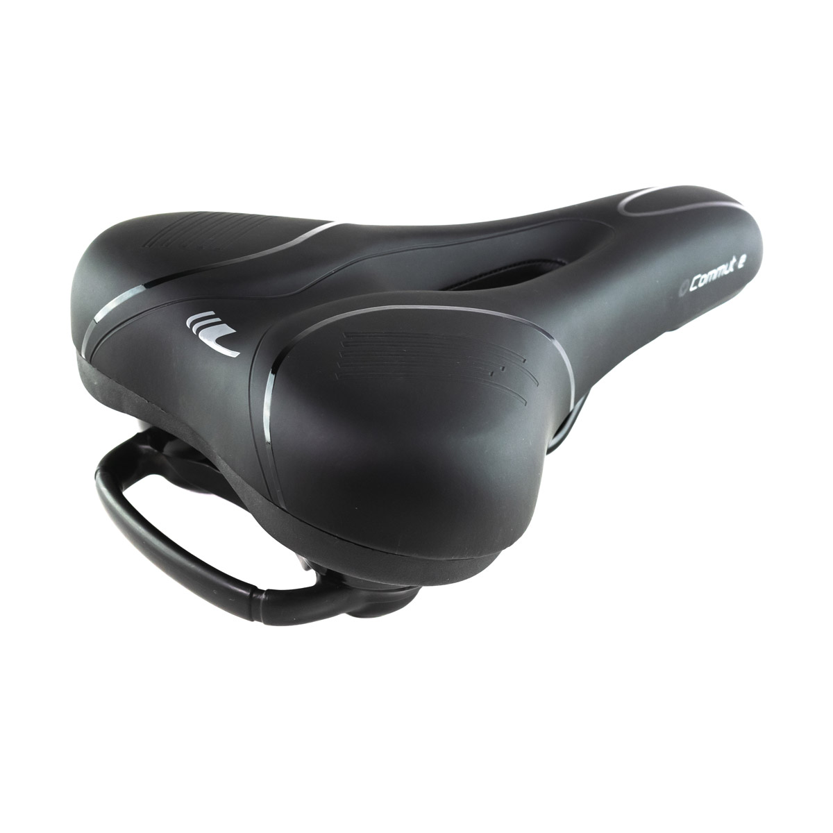 Зручне сідло COMUT-E призначене для комфортної їзди в міських умовах та на легкій місцевості. Комфорт забезпечується двома незалежними системами. Зменшення ударного тиску сідла та поглинання ударів сідла на сідничну кістку забезпечується шляхом розміщення шару піни, яка розподіляє тиск на більшій площі та пристосовується до форми тіла. Шар піни з більш високою щільністю, розміщений під ним, забезпечує загасання вібрації та підвищує стійкість. Заглиблення в центральній частині та отвір зменшують тиск в області між сідничними кістками та збільшують вентиляцію.